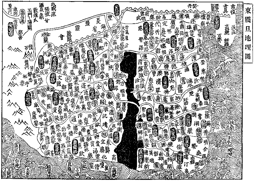 區域之興帝嚳九州(冀兗青徐揚荊豫梁雍)舜十二州(以冀州土闊增置并幽營三州)夏禹平水土分別九州。周大封建。蓋千八百國。春秋之世見於經傳者。百二十有四國。下至戰國七雄并而為秦。懲周封建之弊罷侯置守。分天下為三十六郡。及南平百越。又置閩中南海桂林象四郡。兩漢以十三州統治(漢武帝置十三部刺史)晉為十九州。唐為十道。後又為十五。採訪使凡郡府三百二十有八。縣千五百七十有三。宋朝元豐頒行。李德芻等所撰九域志。分為二十三路(見於圖)郡凡二百九十有五。縣千一百三十有一。化外羈縻之州不與焉。