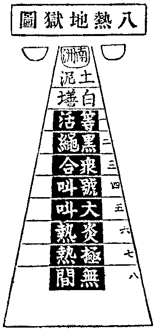 地獄有三。一熱。二寒。三邊。一熱地獄者有八。一名等活。罪人手生鐵爪相摑肉墮。或獄卒唱生。或冷風吹活。兩緣雖異令活一等。人受苦已復至黑沙獄乃至沸屎獄。次第至寒氷獄。然後命終。由身口意造不善業墮此獄中。一一大獄各有十六小獄。周匝圍遶(即婆沙論十六遊增)二名黑繩。以熱鐵繩絣量肢體後方斬鋸。久受苦已至黑沙獄乃至寒氷獄。然後命終。準前受苦加重。由惡意向父母及聲聞墮此獄中。三名眾合。眾多苦具熾然猛熱合來逼惱(餘義準前作)由造三惡業墮此獄中。四名叫喚。獄卒捉人擲鐵鑊中。涌沸叫喚。由瞋恚懷毒墮此獄中。五名大叫喚。置鐵鑊中號咷大叫。由習邪見惡行墮此獄中。六名炎熱。置鐵城中火然焦爛。由燒炙眾生墮此獄中。八名無間(梵語阿鼻或作阿毘)獄卒捉彼罪人剝皮纏身著火車上。萬毒並至無不苦時。為極重罪墮此獄中(十惡五逆也。已上參用長阿含經文)此八地獄在閻浮洲下。重累而住受熱惱苦。前二有主治。次三少主治。後三無主治。二寒地獄者有八。一名頞浮陀。寒苦所切肉生細泡。二名尼賴浮陀。寒風所吹通身成泡。此二從身相受名。三名阿吒吒。脣動不得舌作此聲。四名阿波波。舌不得動脣作此聲。五名嘔喉。喉內振氣作聲。此三從聲相受名。六名欝波羅。此是青蓮華。肉色細拆似此華。七名波頭摩。此是赤蓮華。肉色大拆似此華開。八名分陀利。此是白蓮華。由彼骨拆似此華開。此三從瘡相受名。此八獄在鐵圍山底。仰向居止受寒凍苦。三邊地獄者有三。山間水間曠野。受別業報。此應寒熱雜受(三法度經鍑方宥切大釜)。